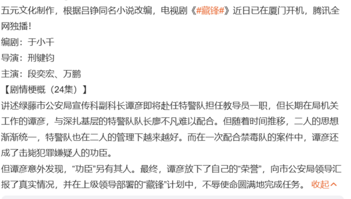 《藏锋》主要报告了绿藤市宣传科副科长谭彦因责任之需调任到了特警队担任导员,从文职转到了武职,倏得的奇迹转机,让他在靠近特警队一桩桩案件时从率先的计无所出到自后的轻车熟路,并重拾初警的故事。