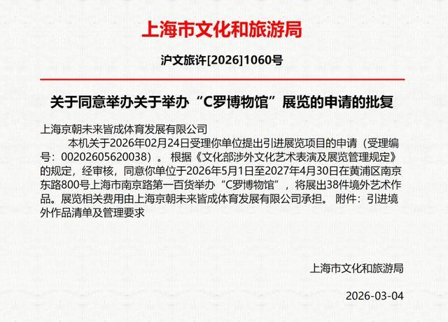 🦄九游娱乐(中国)网址在线上海市文化和旅游局批复:首肯5月至来岁4月举办“C罗博物馆”-九游娱乐(中国)网址在线