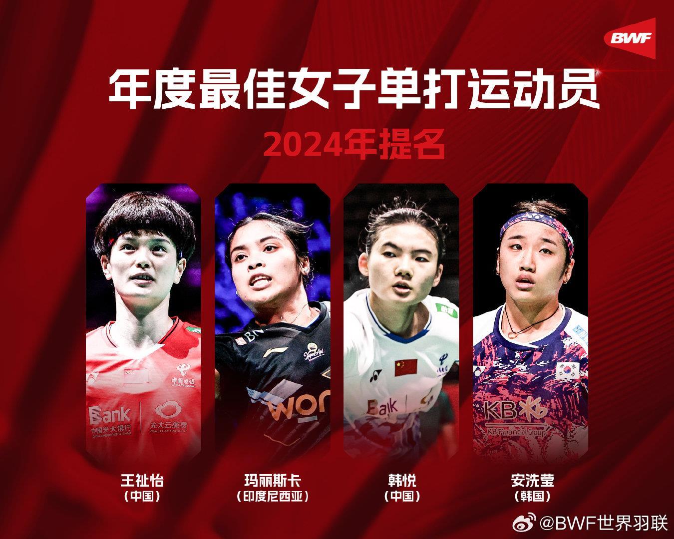 年度最好女子单买绽放员:王祉怡(中国)、玛丽斯卡(印度尼西亚)、韩悦(中国)、安洗莹(韩国)