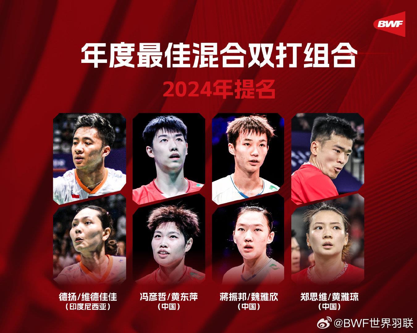 年度最好夹杂双打组合:德扬/维德佳佳(印度尼西亚)、冯彦哲/黄东萍(中国)、蒋振邦/魏雅欣(中国)、郑念念维/黄雅琼(中国)