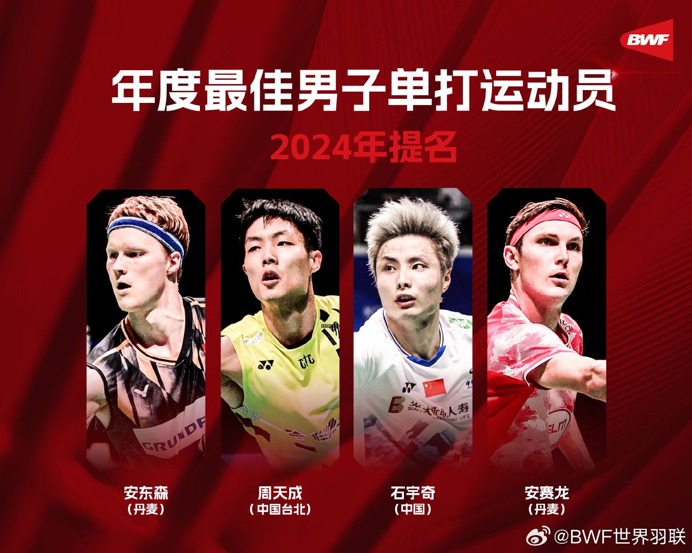 年度最好男人单买绽放员:安东森(丹麦)、周天成(中国台北)、石宇奇(中国)、安赛龙(丹麦)