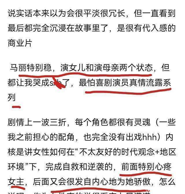 一运行我以为这个故事会很庸碌,但看着看着,就被马丽皆备带进去了。她演男儿和母亲,皆备是两种情状,我径直哭到缺氧。我在电影院看的技巧,周围全是抽鼻子的声息,左近的姑娘姐更是从新哭到尾,纸巾就没离过手。不得不说,马丽此次是竟然冲破了我方,也给当今内娱那些追求“白幼瘦”的女明星们好好上了一课。