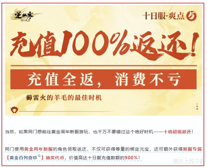 官方还提到了环球追到的充值问题,此次旬日服无谓点卡,还有十倍返还计策,使用黄金服新服脚色返还,再相易迥殊的抽奖代币,原来返还100%充值相易高达900%的数额返还,最高能作念到1000%高额返还!