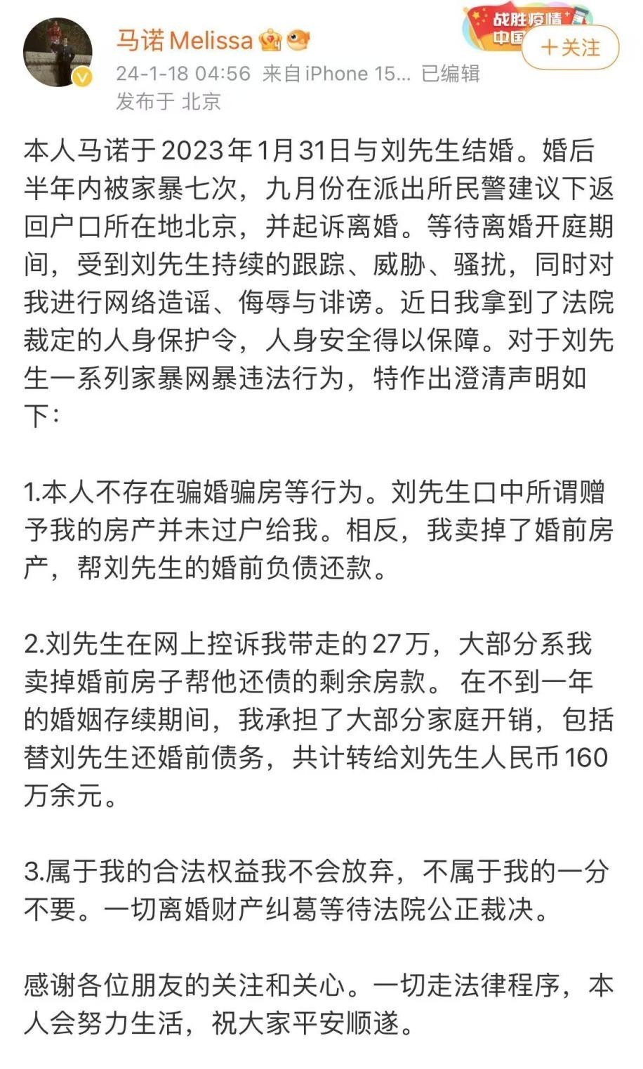 4.极目新闻 2024-01-24——非诚勿扰“良马女”马诺告状永诀,自称闪婚后半年内被家暴7次