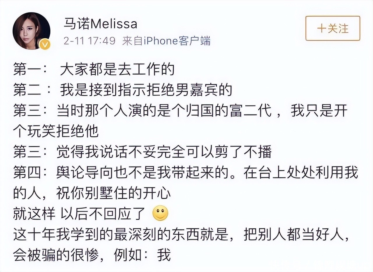 马诺这番话,虽未点名,但显明东说念主都懂,她在喊话《非诚勿扰》节目组。