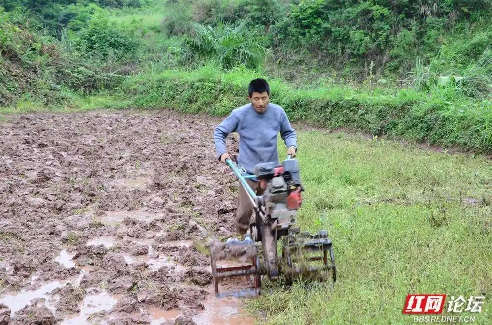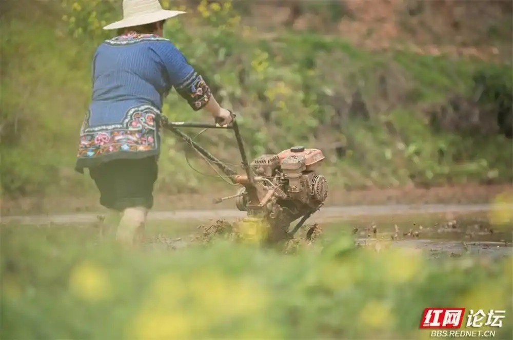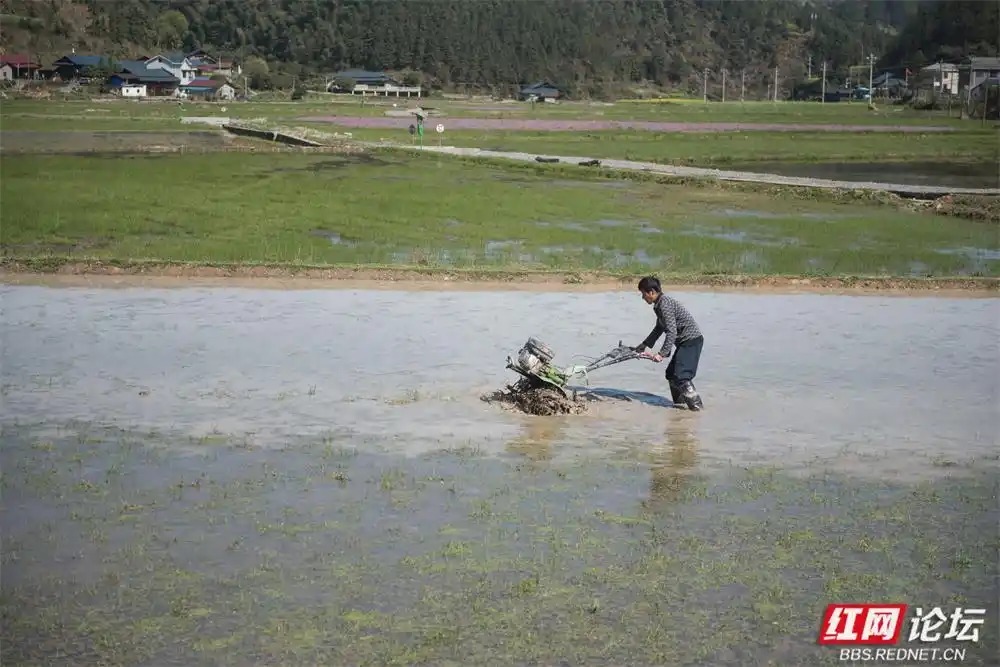 这边,伴跟着轻快的机械声,村民正娴熟地操作着“铁牛”,即微耕机,银色的犁刀速即地翻起整王人的泥浪。