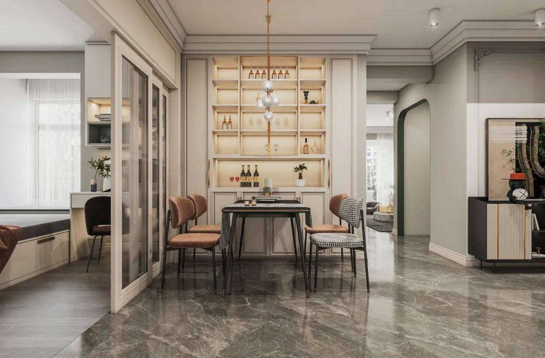 靠墙绸缪一面内嵌式餐边柜,上方通达格用于展示业主保藏的好意思酒,中间留空部分可收纳餐桌上的杂物。玄色餐桌、座椅线条从简运动且不失大方,擢升了餐厅的质感。