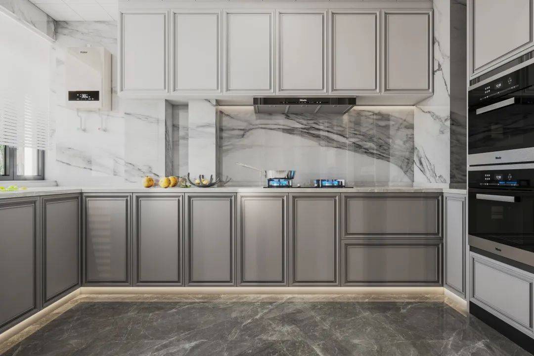 厨房举座以灰色为主色调,橱柜底部吸收守密式灯带绸缪,起到提亮所有这个词这个词空间的恶果。常用厨房电器镶嵌橱柜里面,与炉灶、水槽酿成三角形操作动线,使用起来极为简陋。