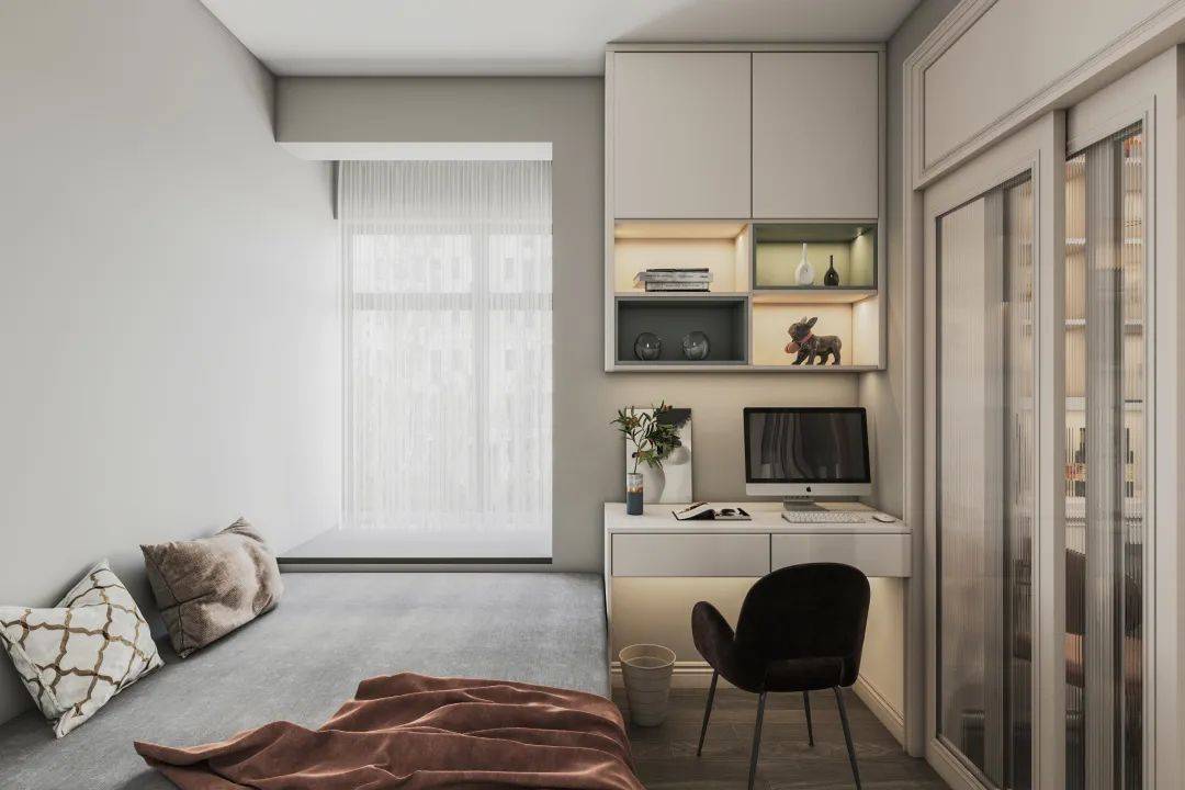 次卧兼作念客卧和书斋使用,鉴于空间面积有限,绸缪榻榻米心仪休憩和收纳两种需求,实用性极高。飘窗区域既可行为床头柜也可行为舒服区使用,搭配一面纱帘,轻柔干预室内的清朗。