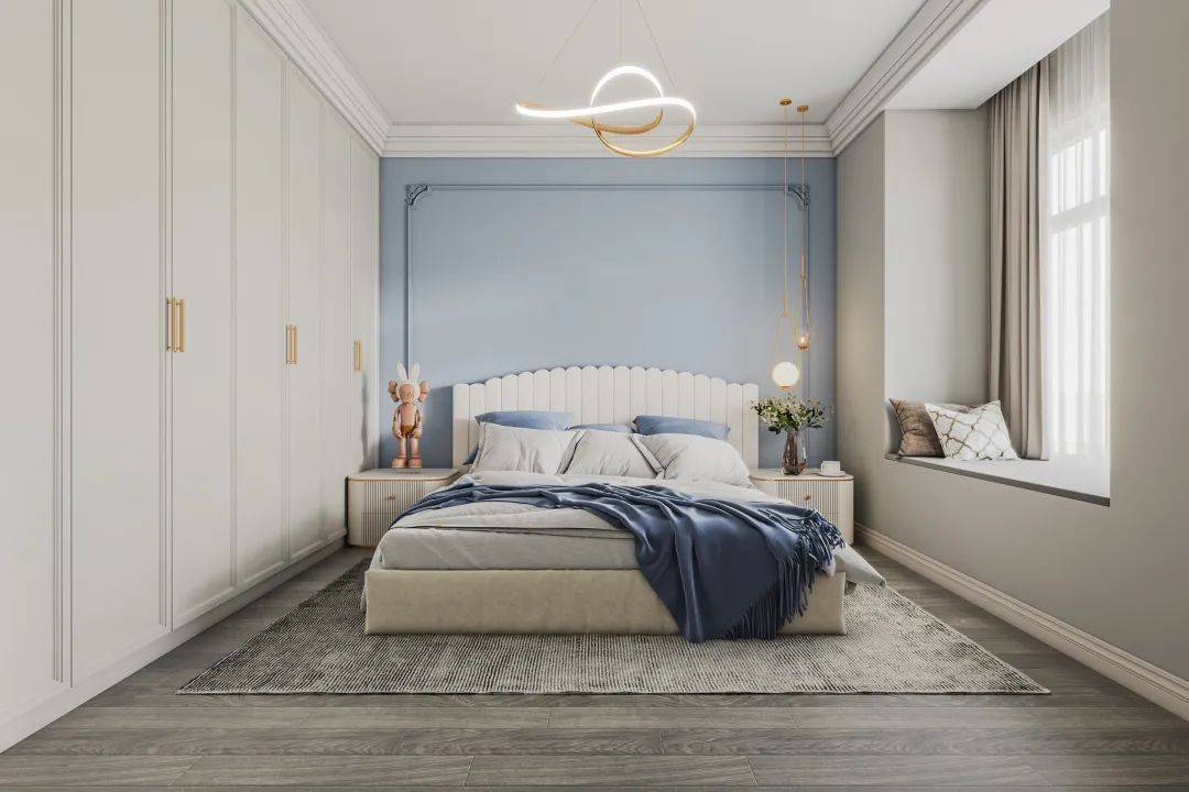 床头配景墙涂刷浅蓝色乳胶漆,营造出宁静舒坦的休憩氛围,搭配石膏线增多墙面的档次感。金属质感的吊灯和柜门行为空间的亮色点缀,颇具质感。
