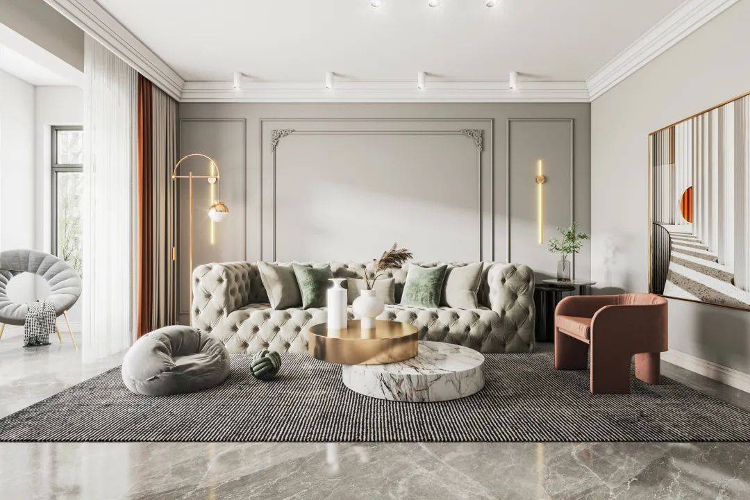 客厅顶部吸收无主灯绸缪,借助筒灯、射灯等多种照明模样,营造出温馨且富裕艺术感的氛围。沙发配景墙应用石膏线进行秘籍造型,增强墙面的档次感。电视配景墙吸收拼色绸缪,淡色配景与悬空电视柜奥秘和会,显得圣洁又前锋。