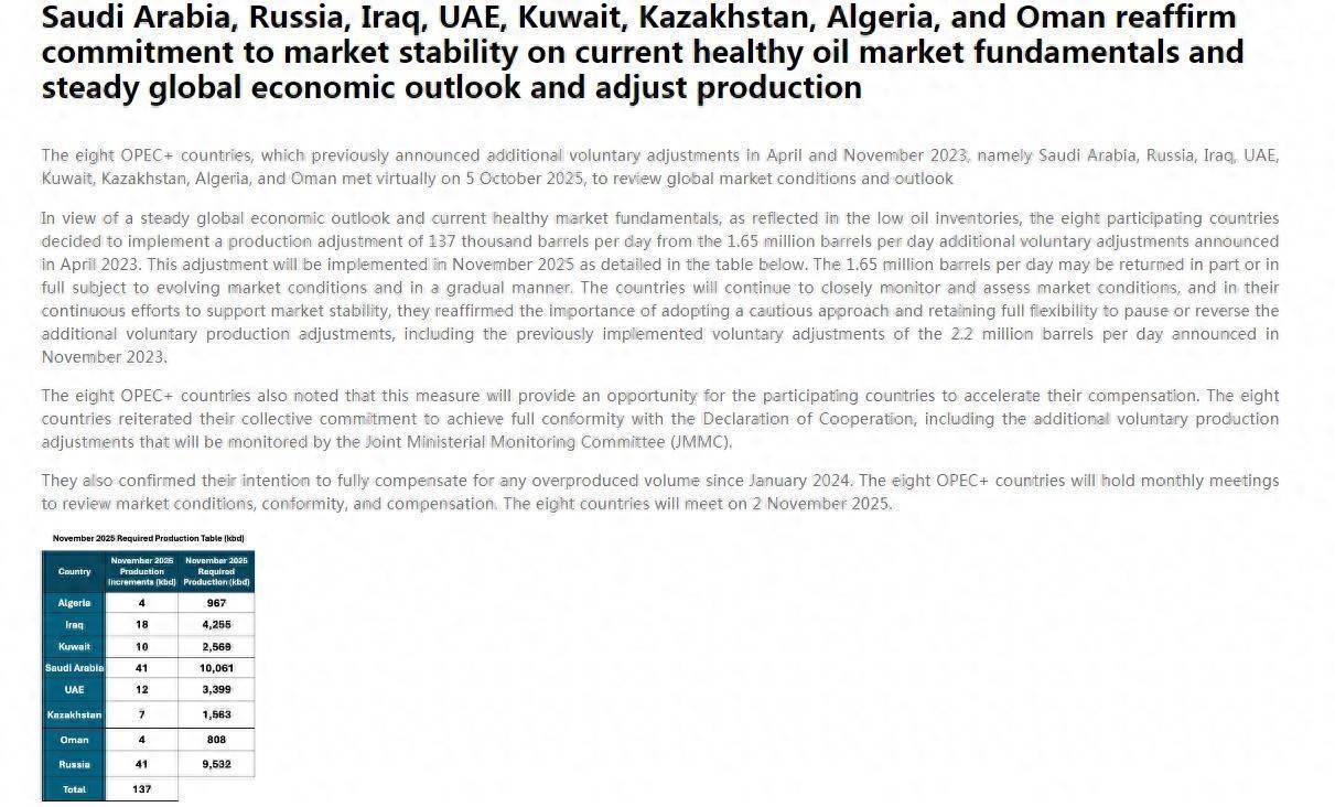 在经过了强烈议论后,产油国定约欧佩克+(OPEC+)上周日告示,将从11月开动逐日增产13.7万桶原油。鉴于阛阓对潜在供应鼓胀的担忧抓续存在,OPEC+这次选拔与10月相易的和缓增产幅度。由于界限低于此前外界预期,周一海外油价跳空高开超1%,脱离四个月低位,不外价钱战风险、宏不雅经济远景和季节性需求下滑可能成为压制油价的短期要素。